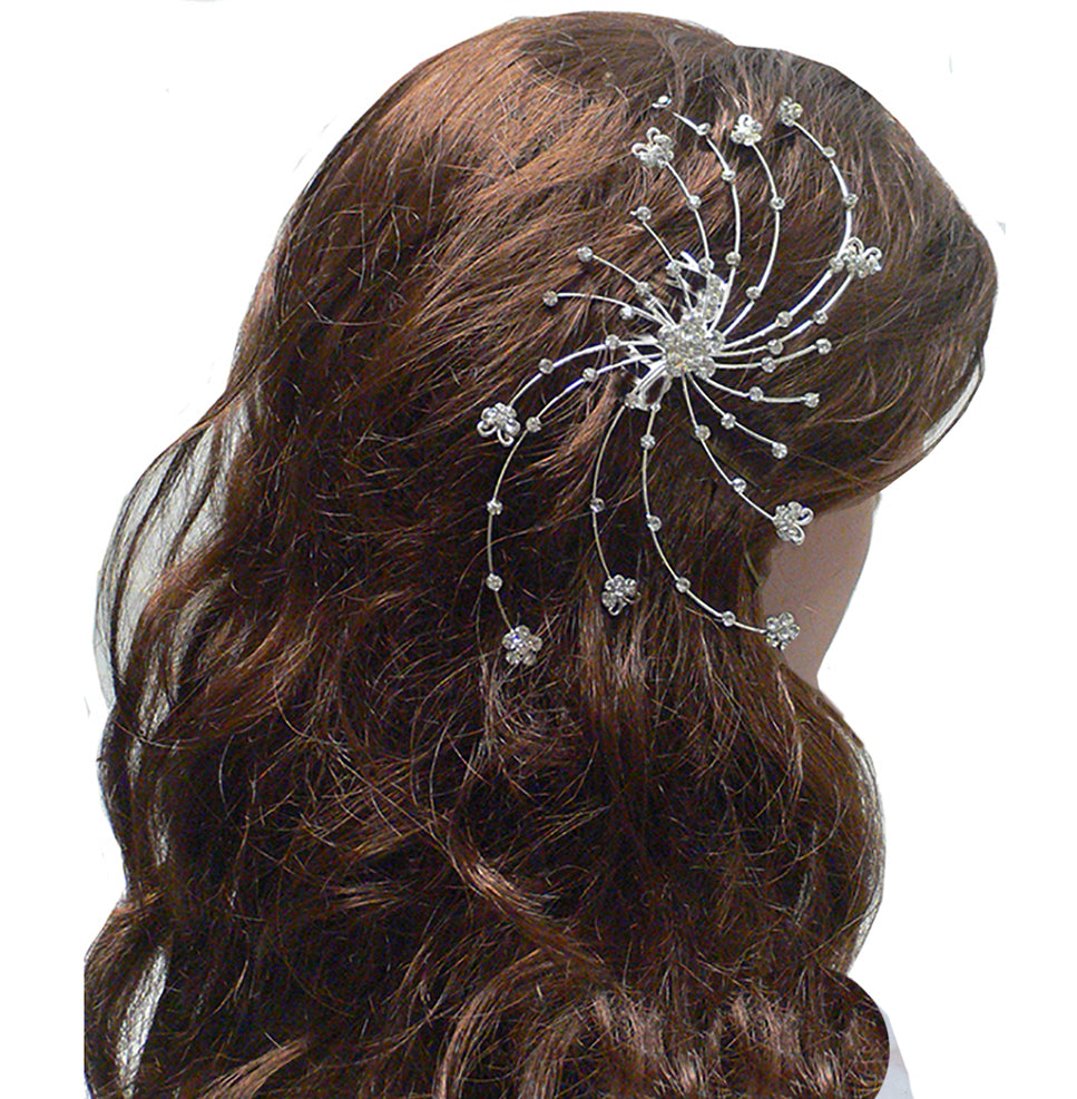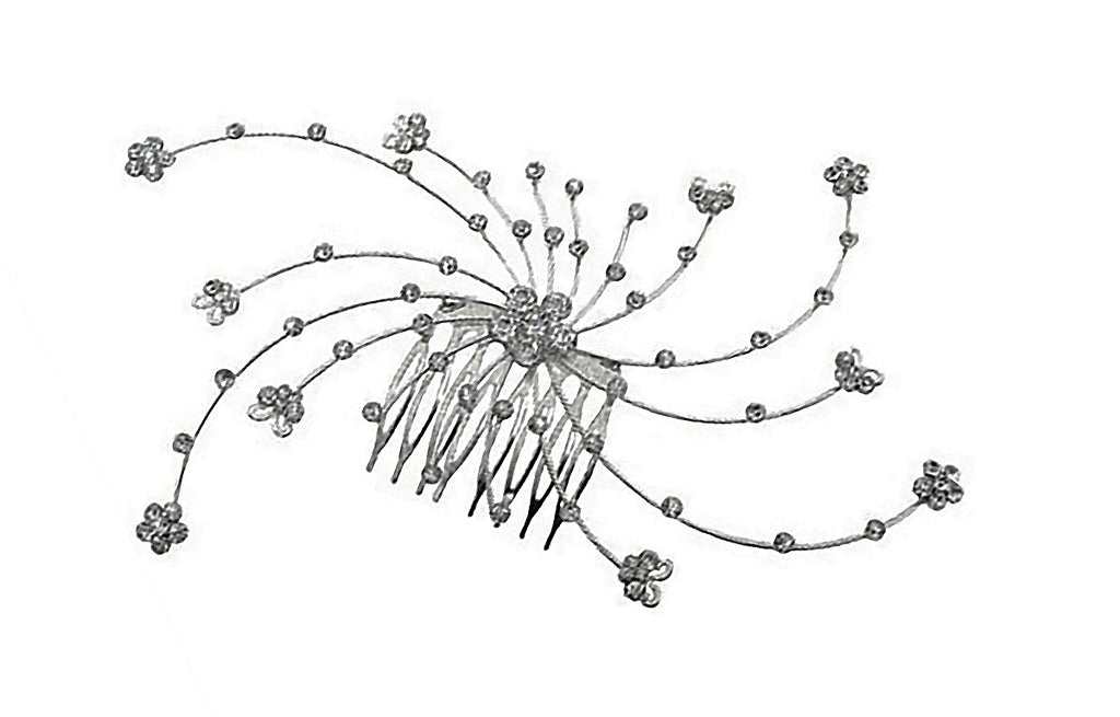 Bridal comb designed with crystal flower and sprigs, silvery white trim, large design measuring 7" x 4". Comb measures 1.65" x 1.5". Style your wedding hairdo with this impressive large flower and sprigs comb.