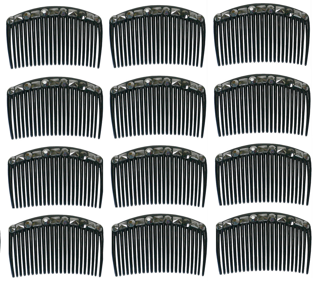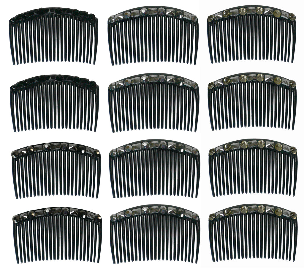 Light Weight Plastic Hair Styling Combs decorated with glittering acrylic stones, available in clear crystal, amber tint, hematite, and in black. Size is 4.5" x 2".