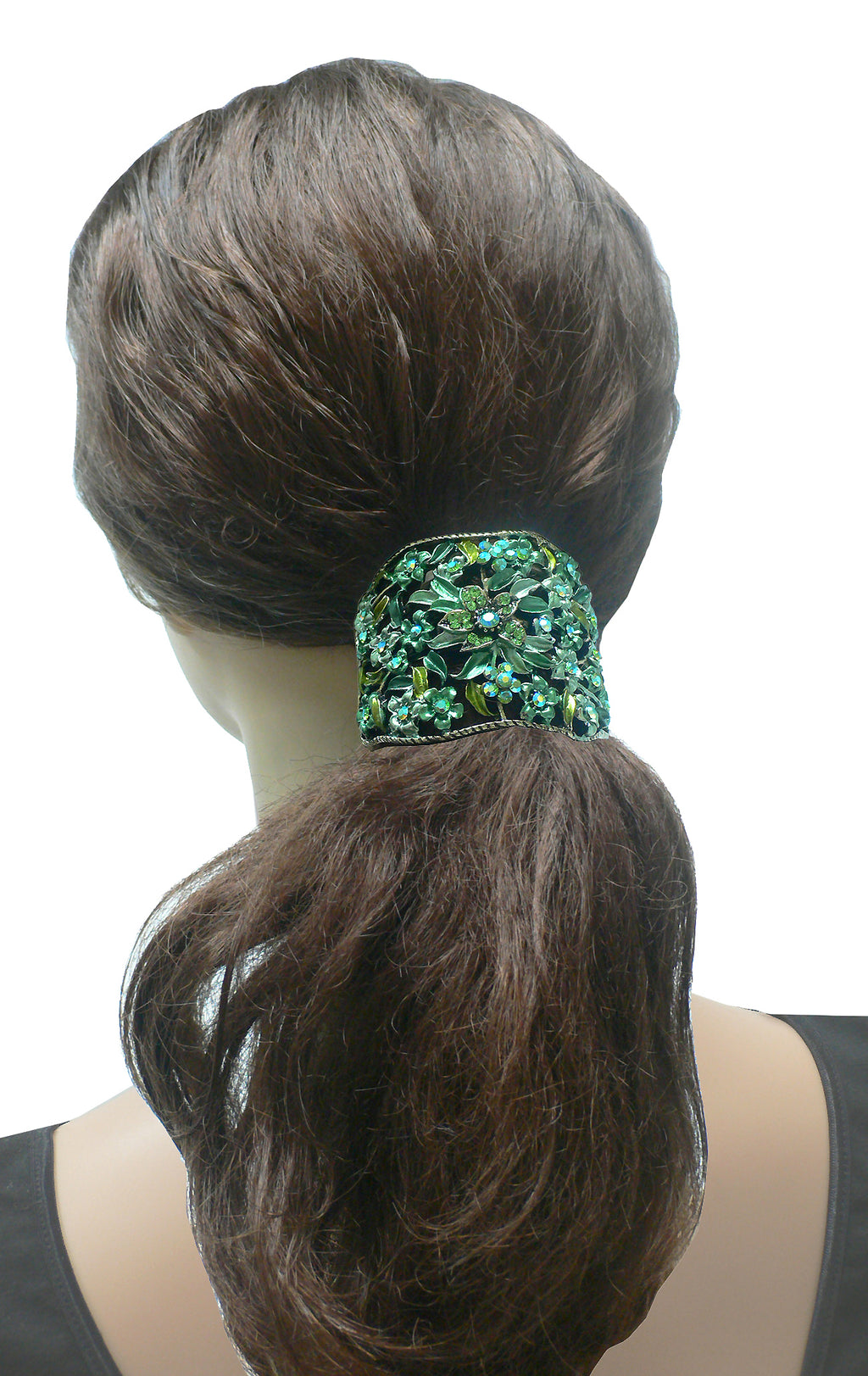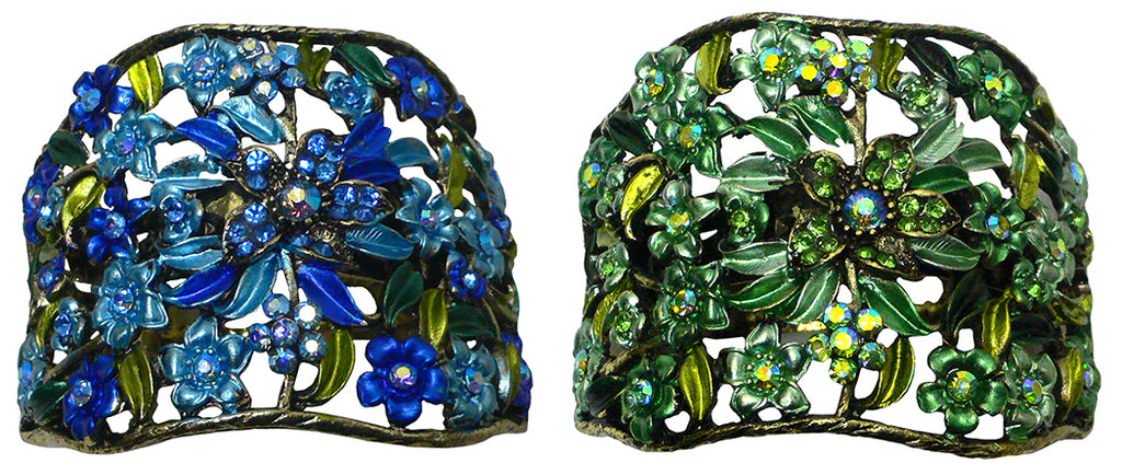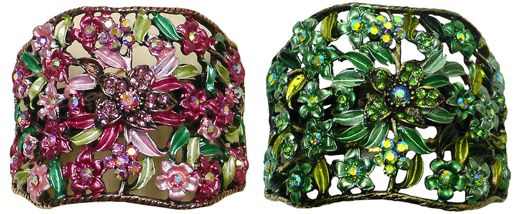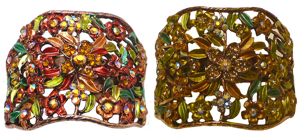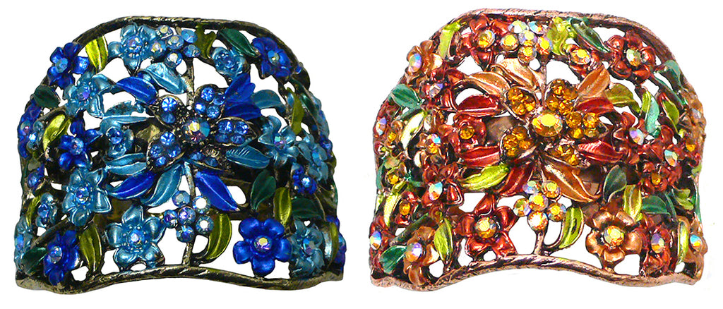 Hair holder barrette for bundling hair together like a ponytail. Beautiful design of flowers and leaves in artistic color combination. High quality hand epoxy painting. Hair holder barrette is half round and measures 2.5" x 2". French Clip. This hair holder barrette is for medium thick hair. For thin hair, first bundle thin hair with a fabric wrapped elastic band for adding thickness to the bundle, then put on the hair holder barrette.