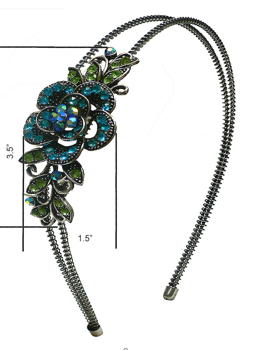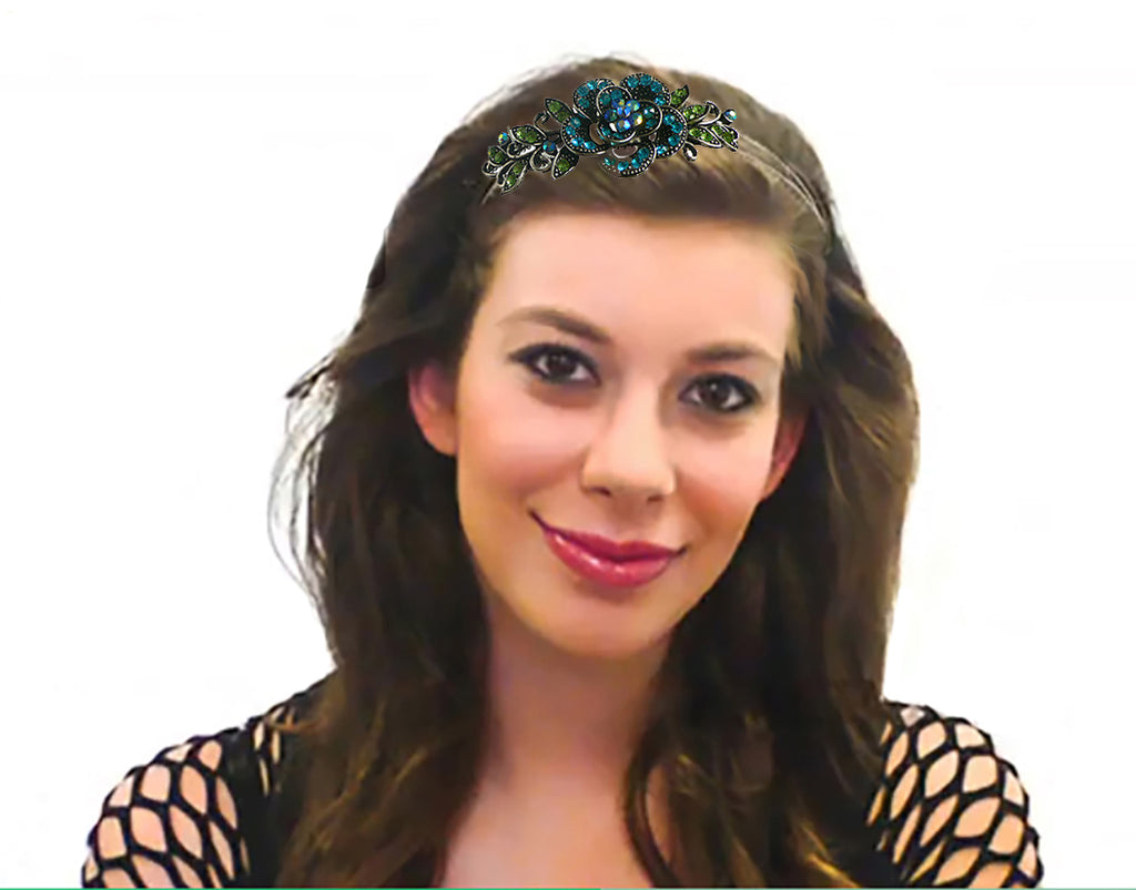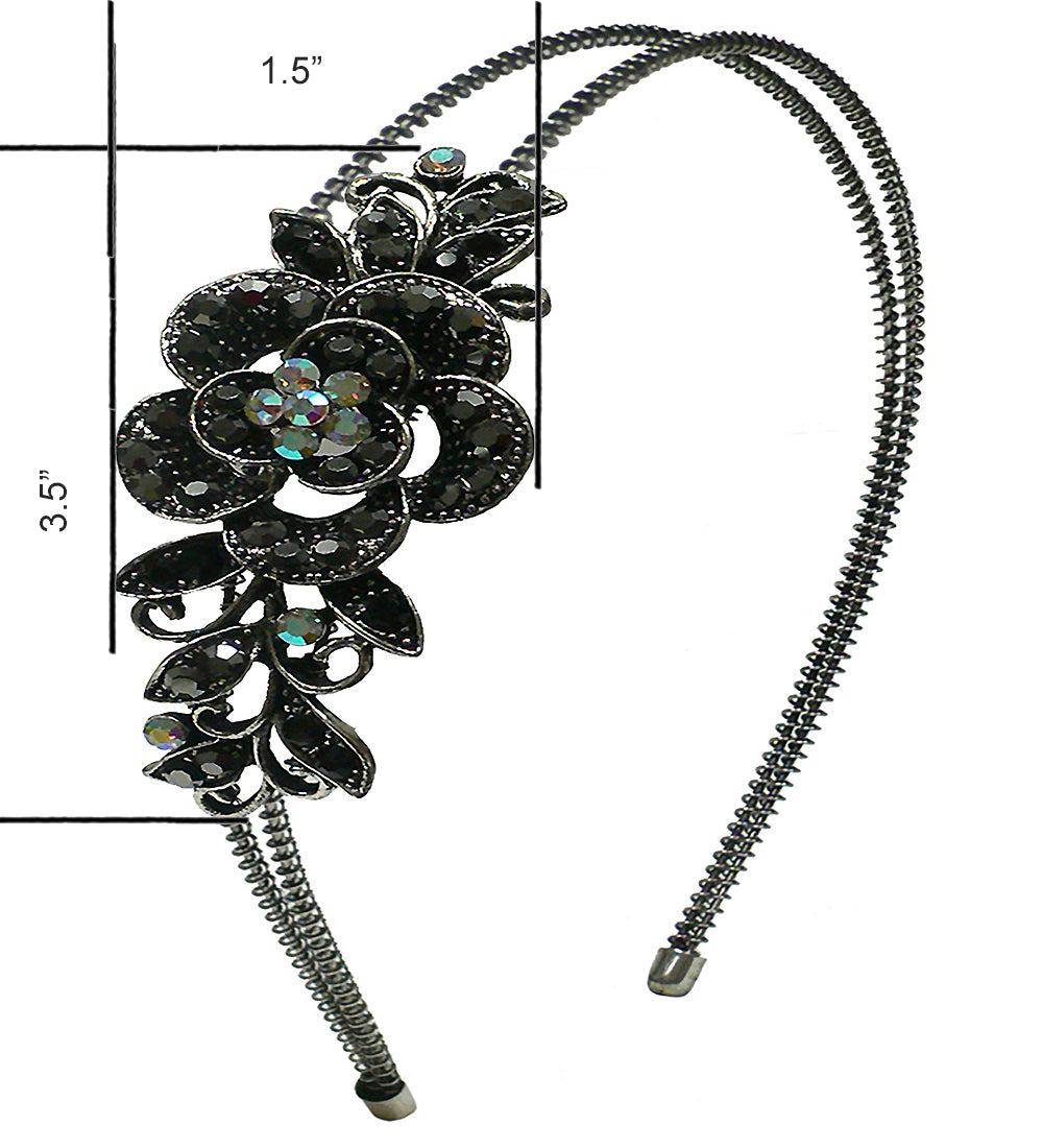 Crystal headband with a flower ornament, hairbands made with resilient wire metal, adjustable for comfortable sizing, flex inward or outward for tighter or looser fitting. Crystal flower ornament measures 3.75" x 1.5".