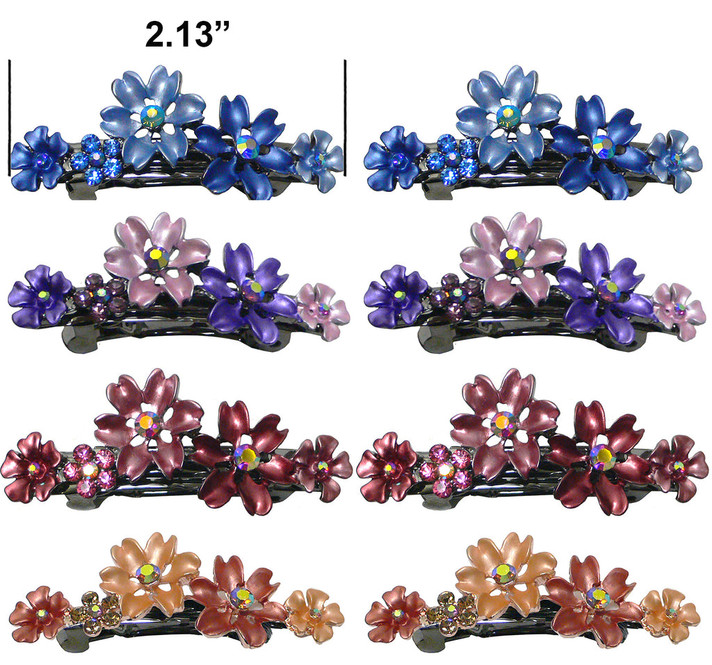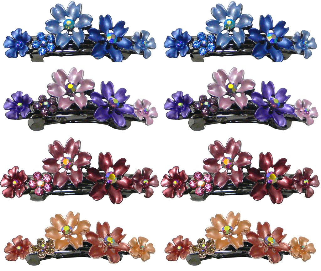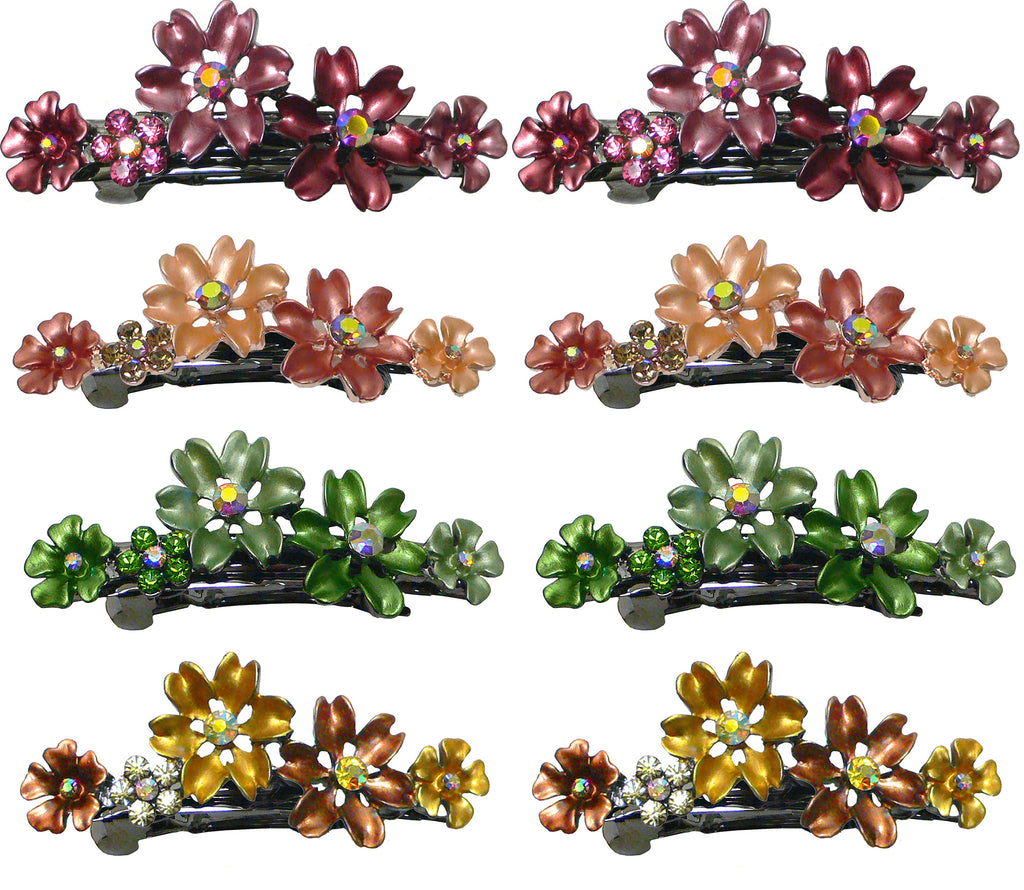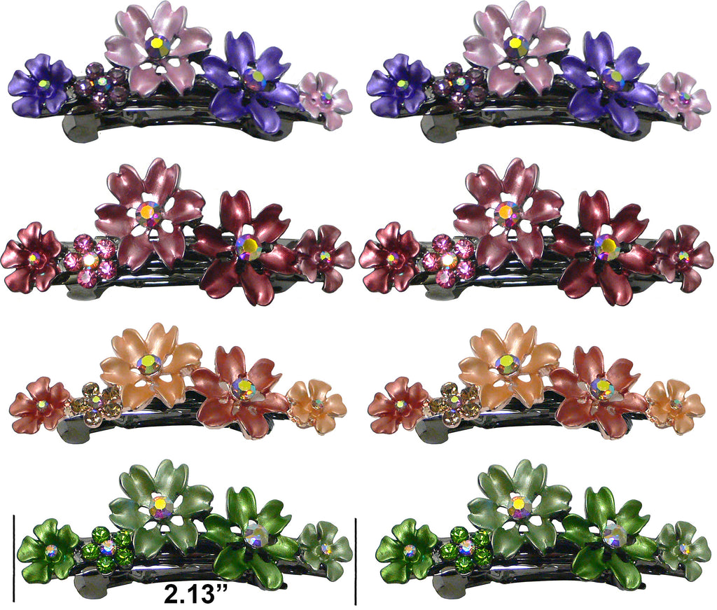 Set of 8 flower barrettes decorated with sparkling aurore boreale crystals, in vibrant colors.  Artistic hand painting.   Hair ornament measures 2.13" x 7/8". Medium/small barrette with French clip clasp for thin to medium hair women girls.  Wear 1 or pair, one on each side of head.