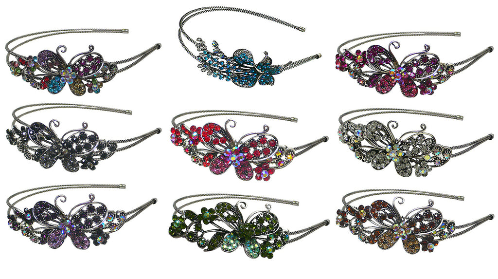 Set of 9 Crystal headbands in 2 unique style, 8 units with ornament in butterfly design, 1 unit in flower bouquet design.  D, double wire hair bands made with resilient wire metal, adjustable for comfortable sizing, flex inward or outward for tighter or looser fitting. Crystal butterfly ornament measures 3.75" x 1.5".  Comes in 9 colors:  multi color, jet, blue, purple, fuchsia, red, green, brown, crystal.